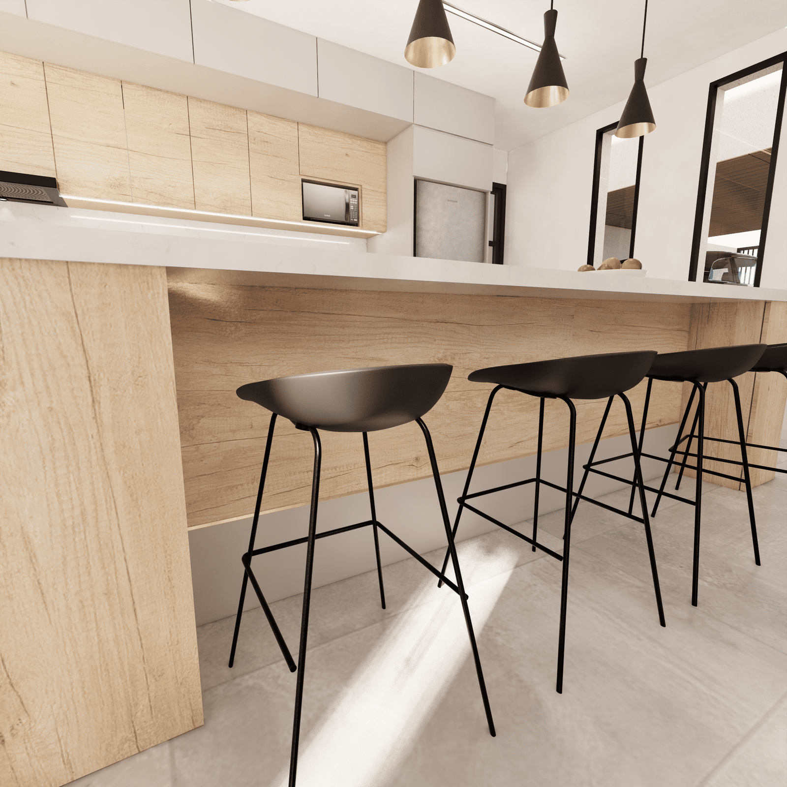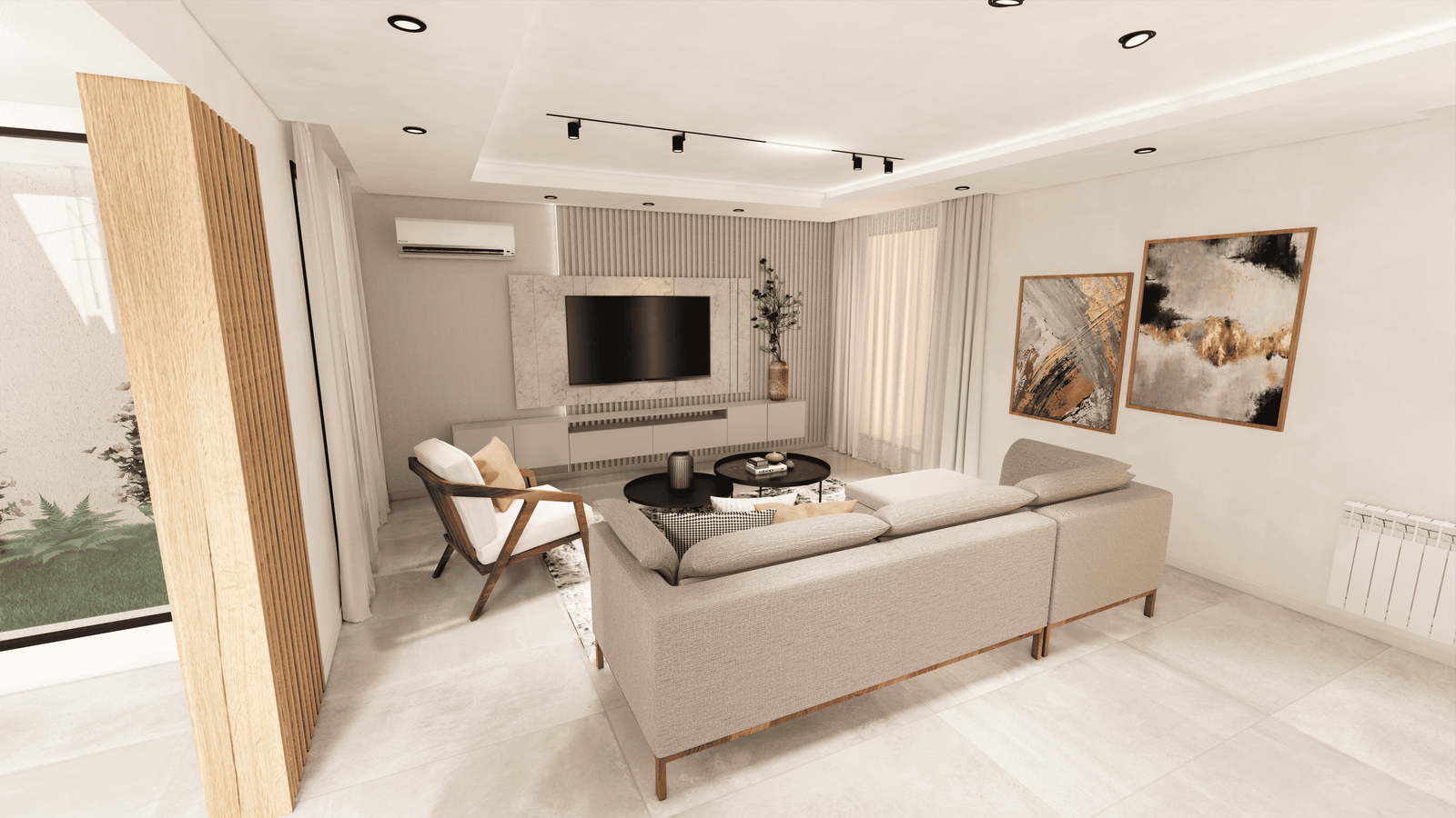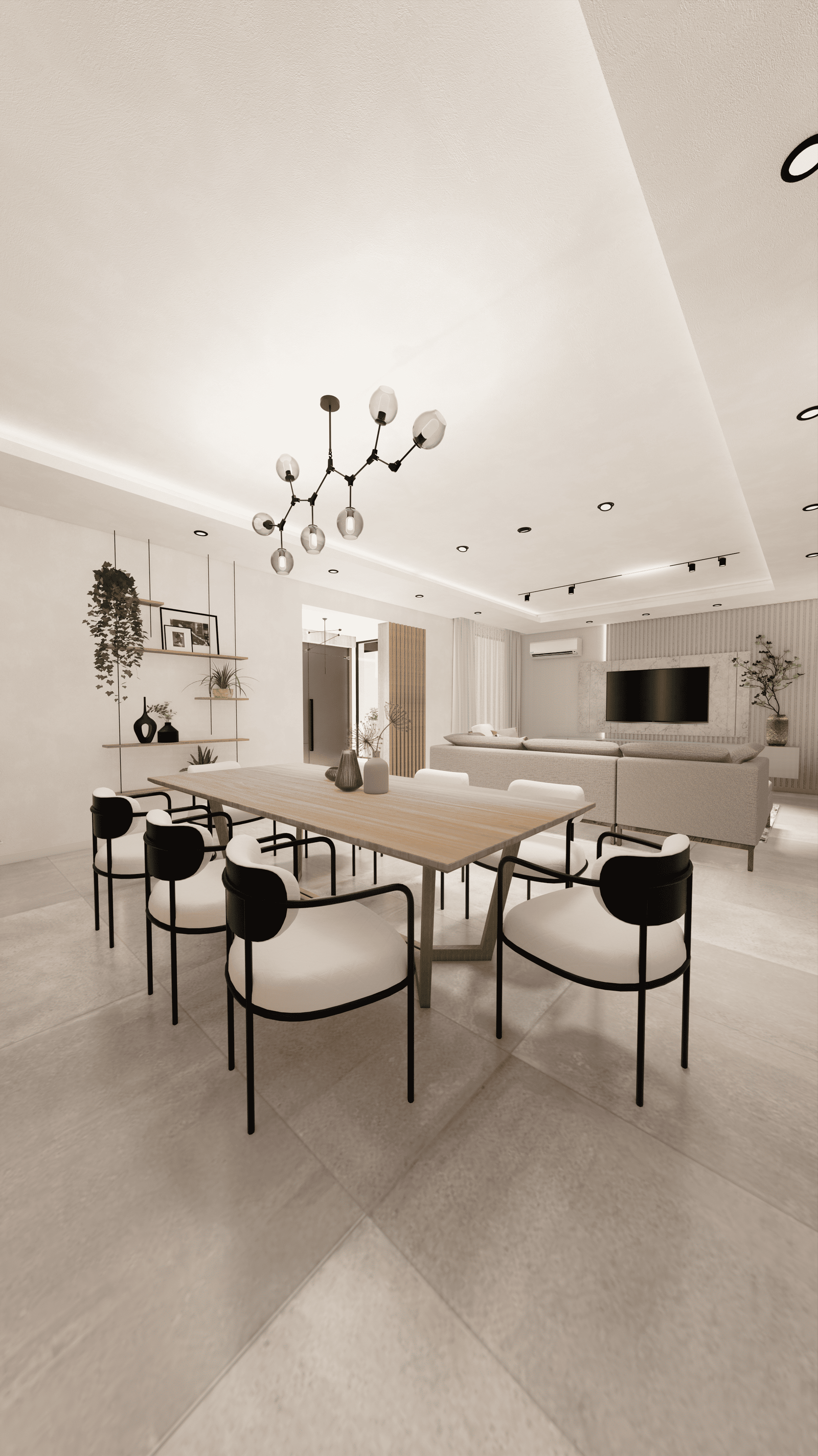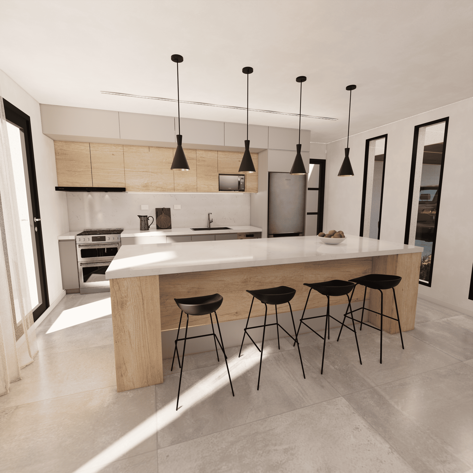 Se asumió este proyecto integral durante la fase de construcción, para crear un hogar funcional y estéticamente armonioso en esta vivienda de 300m², distribuida en dos plantas. La planta baja incluye un hall de entrada acogedor, un espacio de estar y comedor integrados, una cocina moderna con muebles a medida, baños contemporáneos, un lavadero práctico y una galería exterior perfecta para el ocio. En la planta alta, diseñamos habitaciones tranquilas, el vestidor, un playroom versátil y un escritorio funcional. Se seleccionaron cuidadosamente los pisos, revestimientos y la paleta de colores, asegurando coherencia y estilo en toda la vivienda. Diseñamos muebles a medida, elegimos el equipamiento de cocina y seleccionamos mobiliario del mercado que complementa el diseño interior. Además, planificamos un sistema de iluminación que realza cada espacio y diseñamos cielorrasos que añaden distinción.